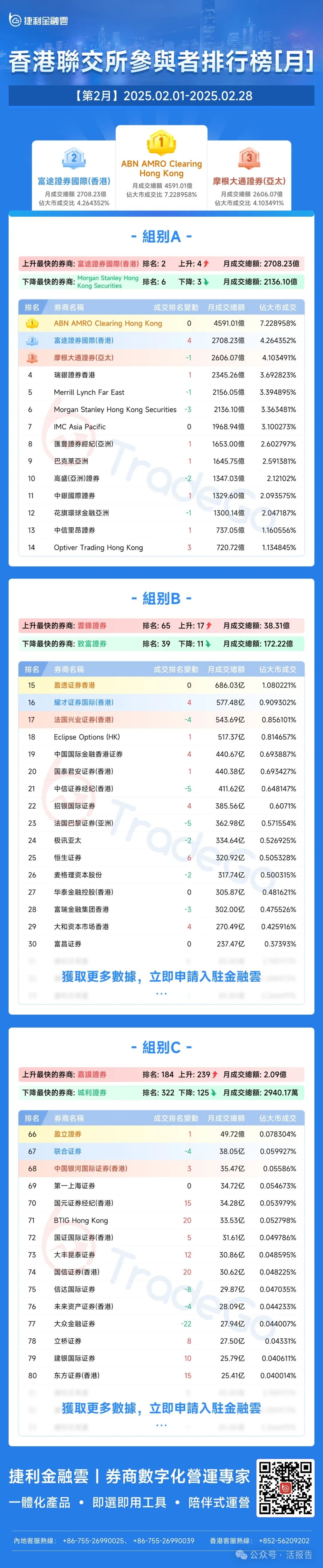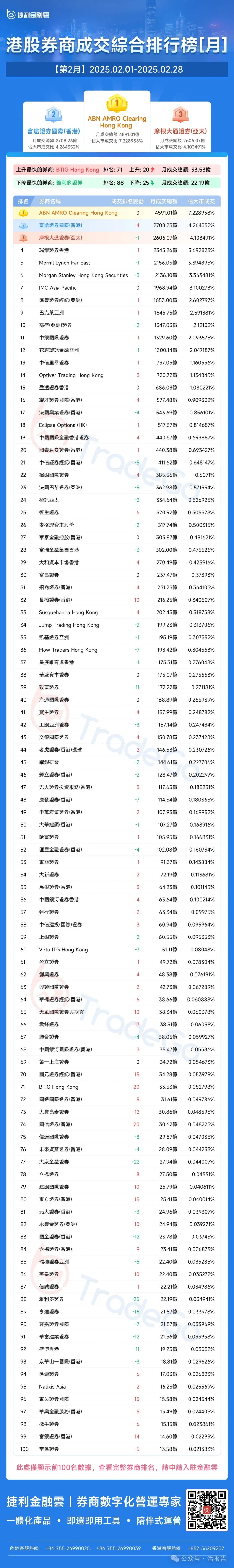 在上月(02.01-02.28),券商綜合排名中,ABN AMRO Clearing Hong Kong穩居第一名, 摩根大通證券(亞太)和 瑞銀證券香港跟隨其后,這三家券商月成交額平均3368.43億;