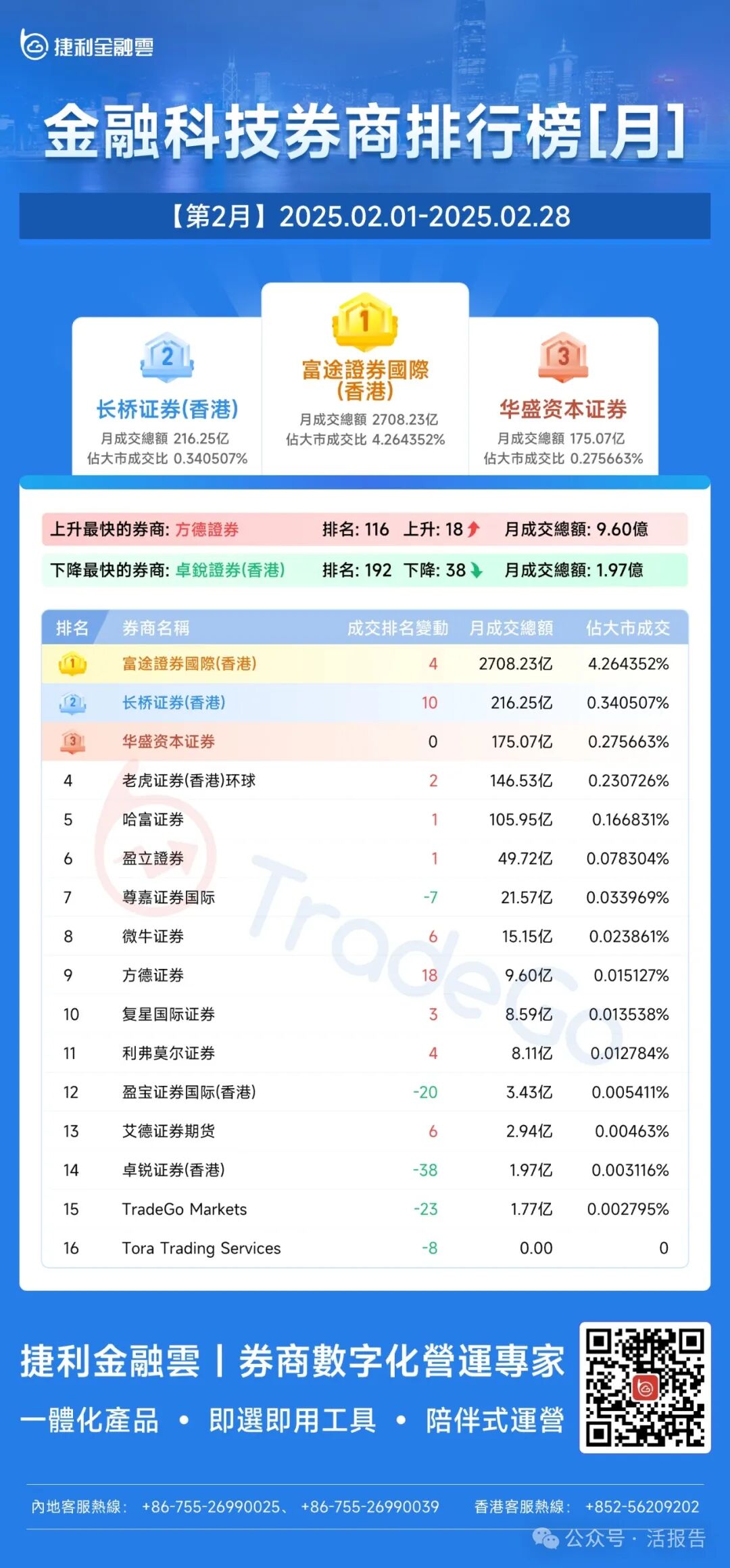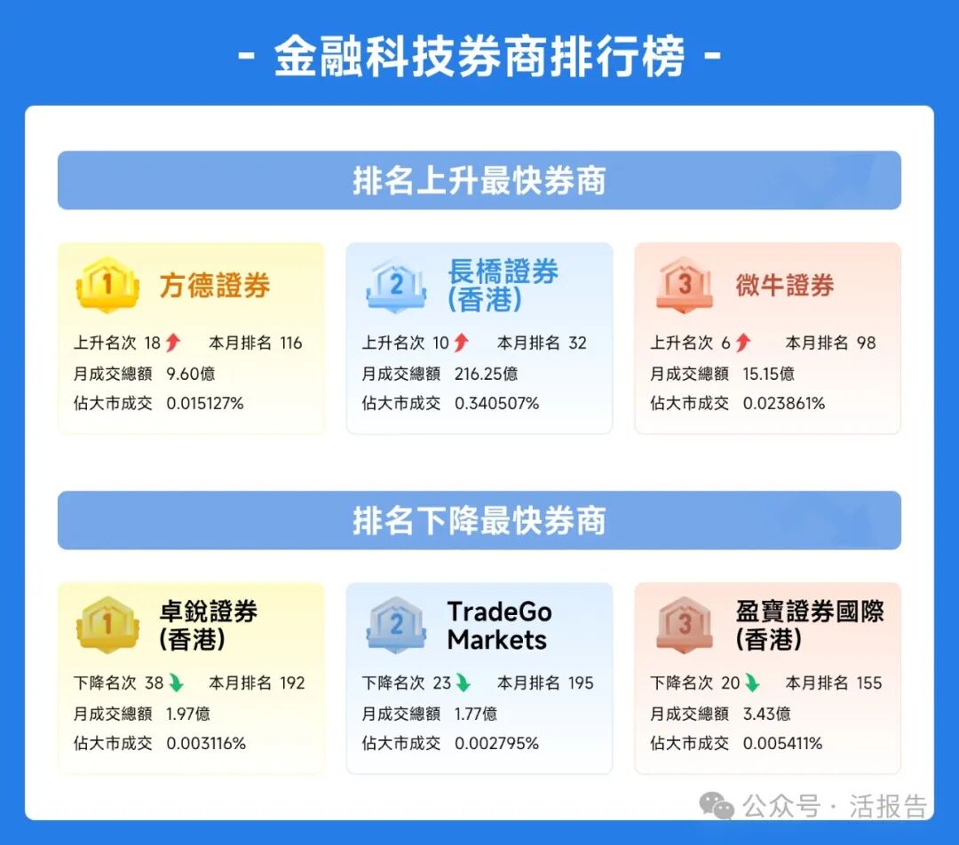根據參照金融科技券商分類統計數據中,富途證券國際(香港)以月成交總額2708.23億依然為該分類的第一名,其中長橋證券(香港)月成交總額216.25億占大市成交比0.27%為金融科技券商排名的第二名,在綜合券商(572家)月排名43名。華盛資本證券月成交總額175.07億占大市成交比0.34%為金融科技券商排名第三名。