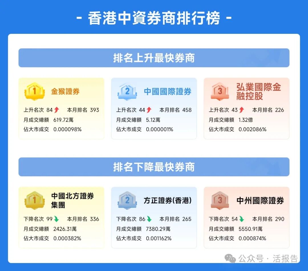 中資券商根據香港中資證券業協會會員而定義的券商排名,僅供參考中資券商中排名異動上升最快的券商為金猴證券、中國國際證券和弘業國際金融控股。其中金猴證券上月成交總額619.72萬,排名393,相較前一月上升了84名。排名異動下降最快的券商有中國北方證券集團、方正證券和中州國際證券。其中中國北方證券集團上月成交總額2426.31萬,排名336名,相較前一月下降了99名。
