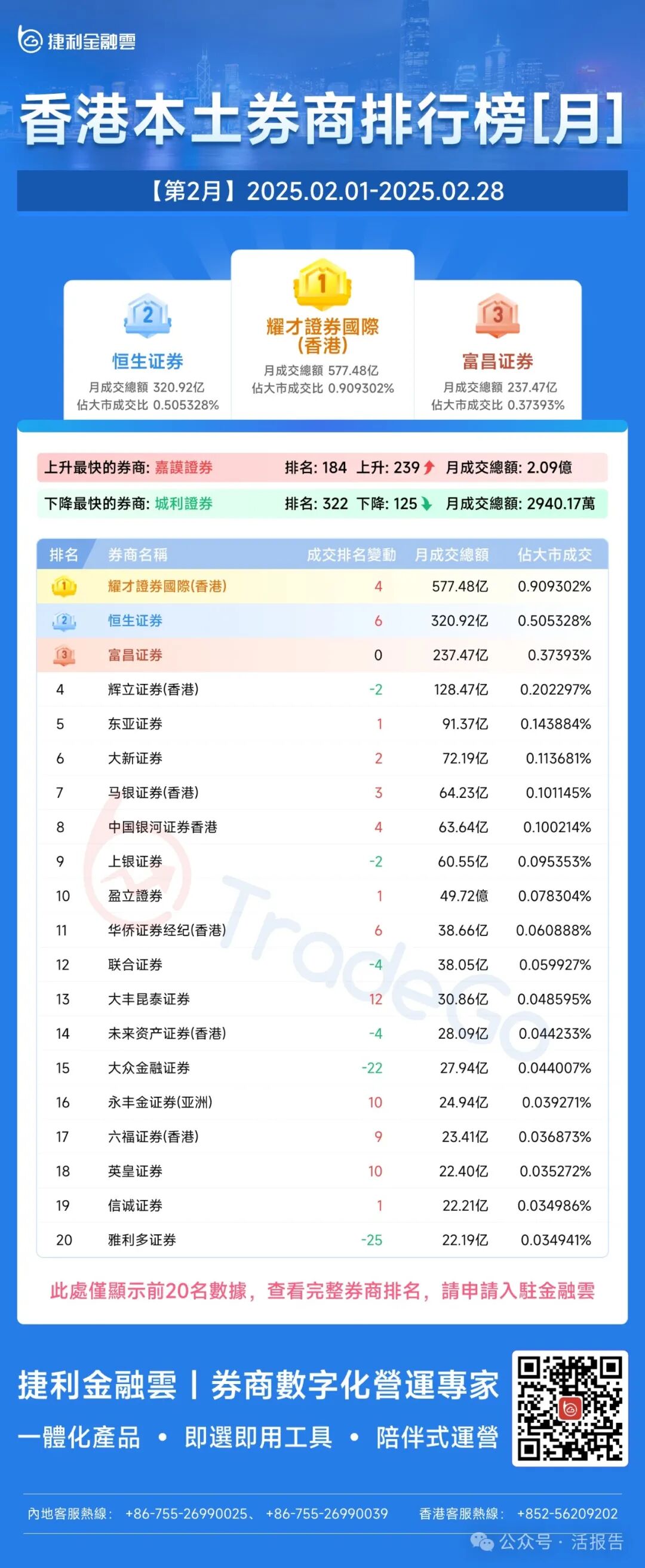 根據參照香港本土券商分類統計數據中,上月TOP20的券商排行中以耀才證券國際(香港)的577.48億成交額(占大市成交比0.9093%)排名第一,恒生證券和富昌證券分別以320.92億、237.47億排名第二和第三名。