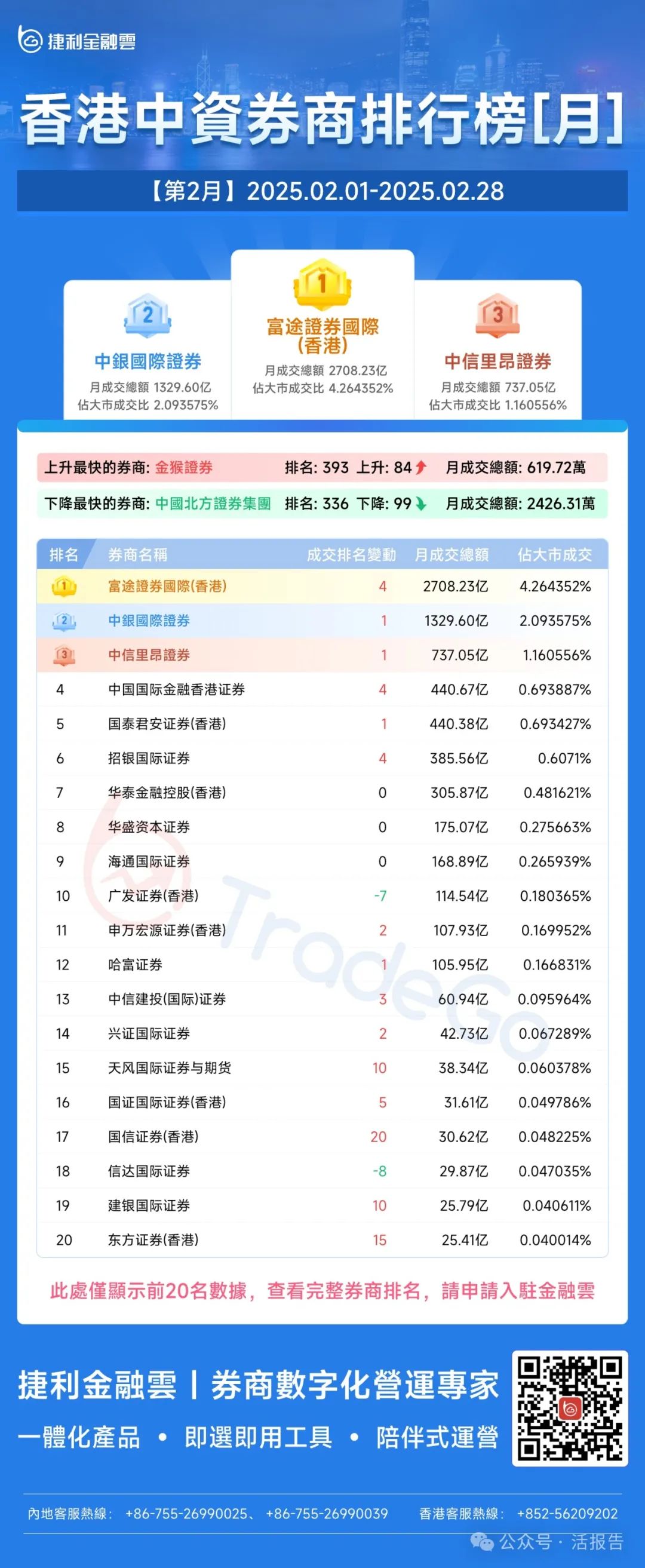 根據參照中資券商分類統計數據中,上月富途證券國際(香港)月成交總額2703.23億,占大市成交4.26%為中資券商排行榜第一名,中銀國際證券月成交總額1329.60億為中資券商第二名,中信里昂證券成交總額737.05億中資券商第三名。