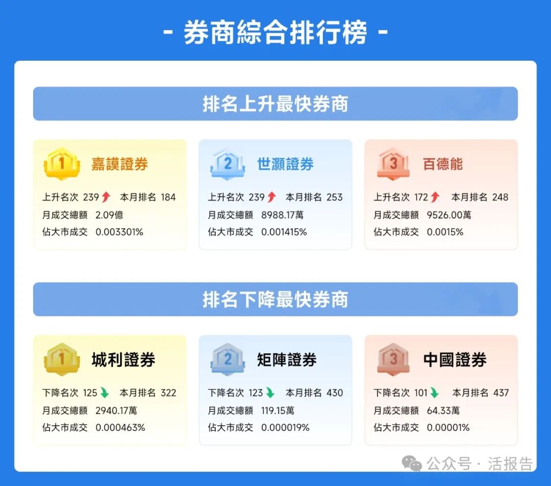 香港本土券商根據香港證券業協會會員而定義的券商排名,僅供參考而在成交異動明顯的券商中:嘉謨證券、世灝證券和百德能上升名次最快,其中嘉謨證券上月成交額2.09億,排名184名,相較前一月上升了239名。成交異動排名下降最快的券商有城利證券、矩陳證券和中國證券,分別下降了125名、123名和101名。