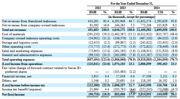 霸王茶姬于2025年3月25日正式向美國證券交易委員會(SEC)公開提交招股書,擬在納斯達克上市,股票代碼為CHA,承銷商包括花旗、摩根士丹利、德銀、中金、老虎證券、富途、華盛證券。公司尚未在招股書中披露發行量及價格區間,但據媒體早先報道,其美股IPO的發行市值或將達到50億美元,可能募資約5億美元。此前,公司已于3月6日獲中國證監會境外上市備案通知書,擬發行不超過約6473萬股普通股。這將是繼古茗、蜜雪冰城之后,今年國內又一家即將登陸資本市場的咖啡茶飲明星企業。霸王茶姬創立于2017年,現已成為中國最大、增長最快和最受歡迎的高端現制茶飲料品牌。公司自創立以來的愿景就是將東方茶飲帶到100個國家,像星巴克一樣,做東方茶飲文化代表。2024年公司全球門店數達到6440家,同比增長83%,其中6284家位于中國。截至2024年底,霸王茶姬在海外共有156家門店,覆蓋馬來西亞、新加坡、泰國等地,并計劃2025年在中國和全球范圍內新開1000~1500家門店。公司2024年GMV達人民幣295億元,同比增長173%;單店月均GMV達51.2萬元,單店月均出杯量達2.5萬杯。截至2024年底,霸王茶姬的手機小程序注冊會員數已達1.773億。2022、2023及2024年,霸王茶姬在中國產生的GMV中分別約79%、87%及91%來自其招牌茶拿鐵產品,其中約44%、57%和61%來自最暢銷的三款茶拿鐵(伯牙絕弦、桂馥蘭香、萬里木蘭)。2022、2023及2024年,公司營收分別為人民幣4.1億、43.96億及116.32億元,同比分別增長971.5%及164.6%,2024年加盟店收入占93.8%;凈利潤分別為-0.91億、8.03億及25.15億元,2024年同比增長213.3%,凈利率達20.3%。中國現制茶飲市場的GMV由2019年的人民幣1,022億元增長至2024年的人民幣2,727億元,復合年增長率達21.7%,超過整體茶飲市場中的其他細分市場。到2028年市場規模預計將達到人民幣4,260億元,復合年增長率為11.8%。截至2024底,霸王茶姬于中國境內及境外共有6,440家門店,是中國所有高端現制茶飲品牌中門店網絡規模最大的品牌,市場份額為20.3%。按中國地區GMV衡量,霸王茶姬也是門店超1000家的品牌中增長速度最快的一家。霸王茶姬的董事長、CEO為張俊杰,他目前也是海底撈的獨董。COO為尹登峰,CFO為黃鴻飛,副總裁有陸冕、胡維仁、徐馳,董事中還包括海底撈創始人張勇。IPO前,張俊杰持有19.9%的A類股及38.7%的B類股,尹登峰持有7.1%的A類股,XVC持有20.3%的A類股,琮碧秋實持有10.6%的A類股。資料顯示,霸王茶姬于2021年連續完成合計超過3億元的A輪和B輪融資,A輪融資由XVC和復星聯合領投,B輪融資由琮碧秋實領投、XVC跟投。(本文首發于活報告公眾號,ID:livereport)