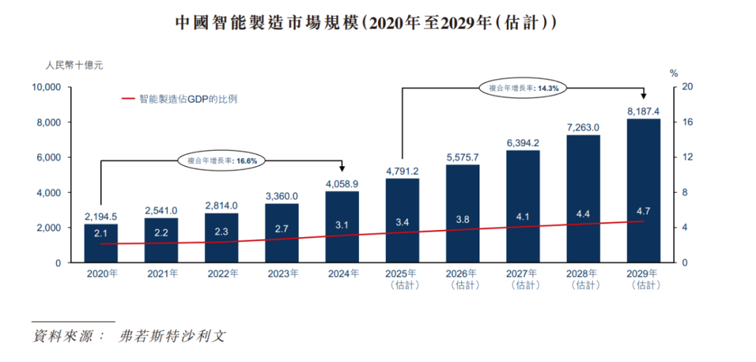 根據弗若斯特沙利文的資料,數字技術日益普及,政府舉措促進產業升級,高質量制造產出的需求日益高漲,推動中國智能制造市場從2020年的人民幣21,945億元增至2024年的人民幣40,589億元,復合年增長率為16.6%。將該行業對GDP的貢獻從2020年的2.1%提升至2024年的3.1%。預計該市場將于2029年達到人民幣81,874億元,2025年至2029年的復合年增長率為14.3%。與此同時,對可持續制造實踐的推動和對靈活供應鏈的需求將進一步加速 應用,預計到2029年智能制造將占中國GDP的4.7%。