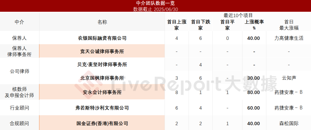 據LiveReport大數據統計,翼菲科技中介團隊共計7家,其中保薦人1家,近10家保薦項目數據表現不穩妥;公司律師2家,綜合項目數據整體表現兩極。整體而言中介團隊歷史數據表現不太平穩。