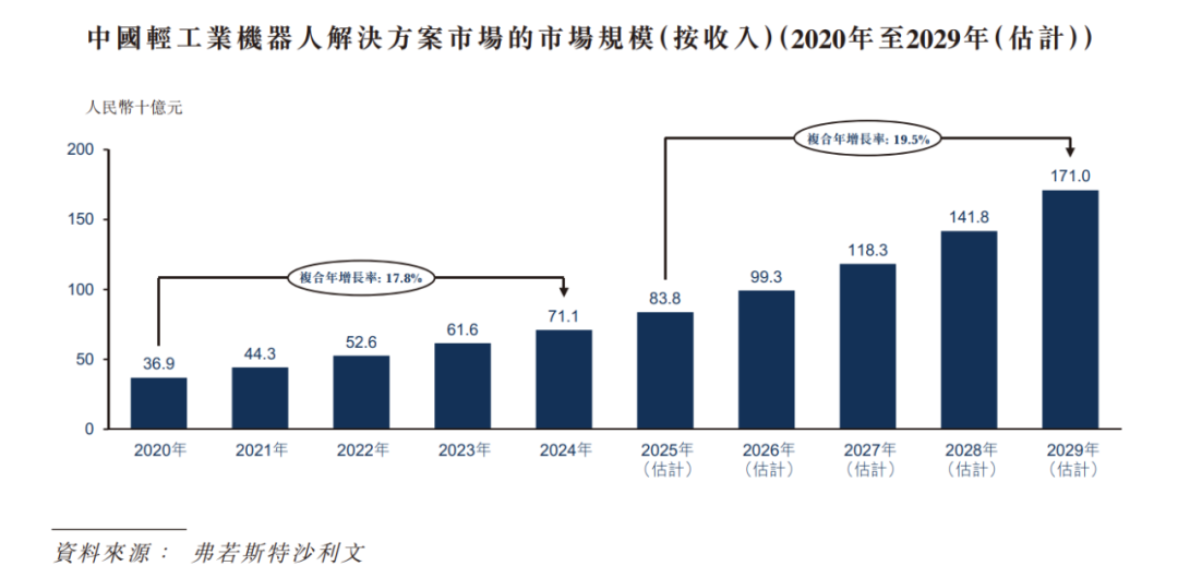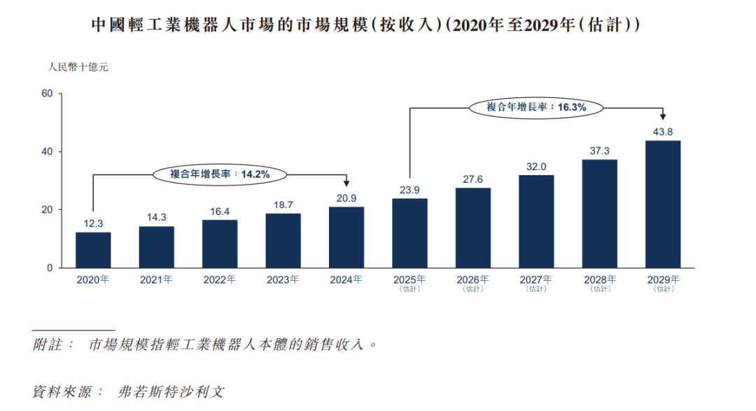 根據弗若斯特沙利文的資料,按收入計,中國輕工業機器人市場由2020年的人民幣123億元增至2024年的人民幣209億元,復合年增長率達14.2%。隨著越來越多的行業領域尋求通過機器人自動化來提高效率和精度,中國輕工業機器人市場預計將在未來持續增長。該市場預計到2029年將達到人民幣438億元,2025年至2029年的復合年增長率為16.3%。