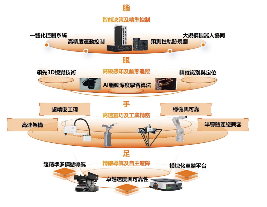 公司構建了全棧機器人架構,圍繞"腦、眼、手、足"四大核心功能: