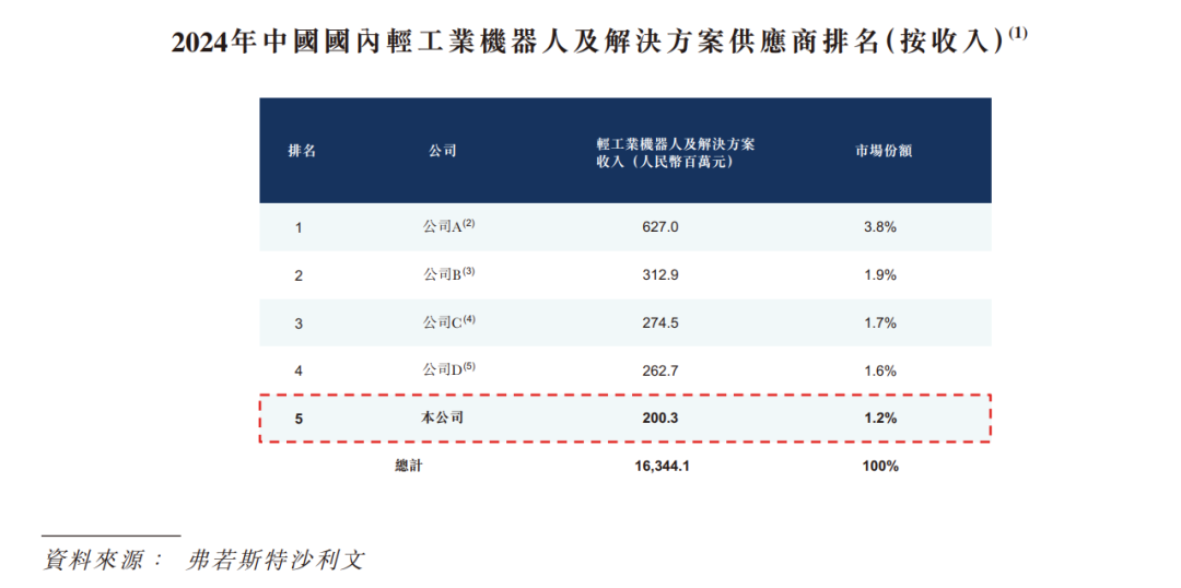 按2024年相關收入計,公司在中國市場五大國內輕工業機器人及解決方案供應商中排名第五。