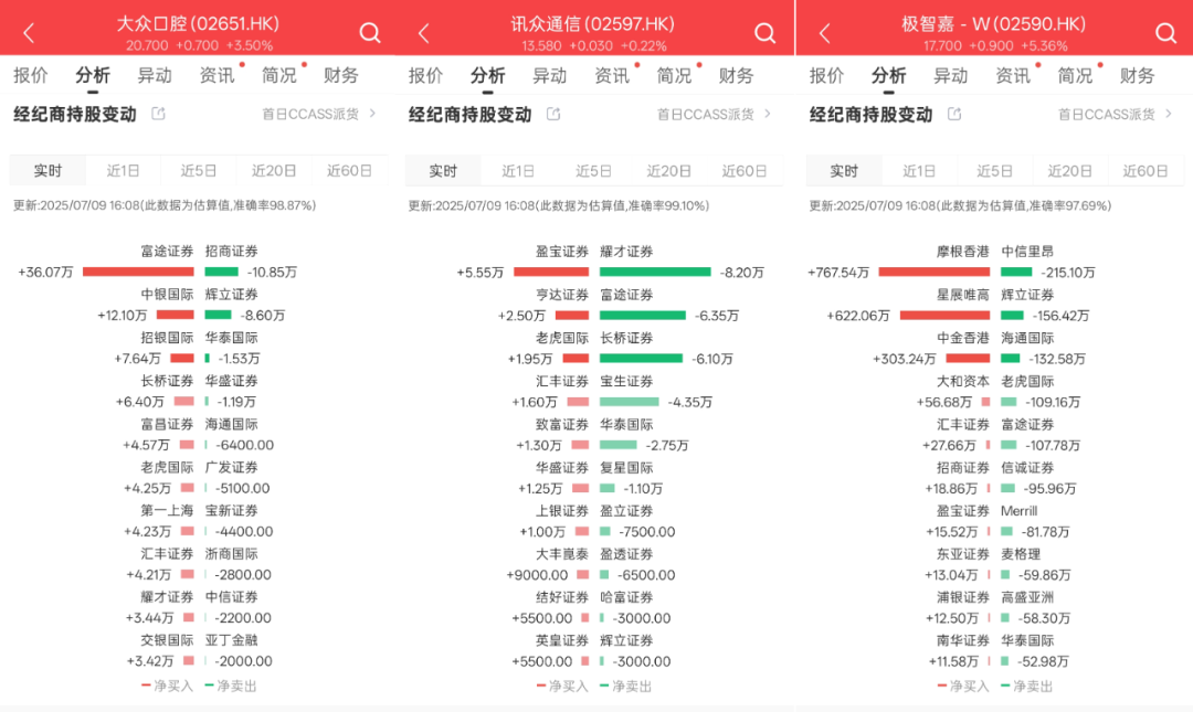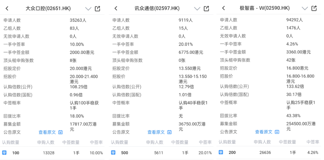 上市首日,三家公司中大眾口腔做為唯一一家套路回撥的公司,以24港元高開,早盤一度拉升至日內最高27.5港元,最高上漲37.5%,不過后續一路走低,最終收20.70港元,僅上漲3.50%,最新市值約為10.22億港元,全天成交約396.23萬股,成交額約9404.72萬港元。訊眾通信股價高開7.15%,早盤迅速下挫至日內最低12.2港元,最低跌近10%,雖盤中立馬回升至發行價附近,但未能繼續上行,最終收13.58港元,微漲0.22%,最新市值約16.53億港元,H股市值約4.13億港元。全天成交222.70萬股,成交額約3035.80萬港元。極智嘉-W股價則略微高開,上午盤亦如訊眾通信差不多的走勢,不同的是,極智嘉-W在下午盤后半段開始上攻,最終收17.70港元,收漲5.36%,最新市值約233.75億港元,H股市值約178.32億港元。全天成交7838.35萬股,成交額約13.24億港元。經紀商持股變動方面,凈買入大眾口腔最多的經紀商是富途證券、中銀國際、招銀國際,分別凈買入36.07萬股、12.10萬股、7.64萬股;凈賣出最多的是招商證券、輝立證券、華泰國際,分別凈賣出10.85萬股、8.6萬股、1.53萬股。凈買入訊眾通信最多的經紀商是盈寶證券、亨達證券、老虎國際,分別凈買入5.5萬股、2.5萬股、1.95萬股;凈賣出最多是的耀才證券、富途證券、長橋證券,分別凈賣出8.2萬股、6.35萬股、6.1萬股。凈買入極智嘉-W最多的經紀商是摩根香港、星展唯高、中金香港,分別凈買入767.54萬股、622.06萬股、303.24萬股;凈賣出最多是的中信里昂、輝立證券、海通國際,分別凈賣出215.1萬股、156.42萬股、132.58萬股。配售結果顯示,大眾口腔本次申購人數共35,263人,公開認購108.25倍,國配認購0.96倍,套路回撥至18%,一手中簽率10%;