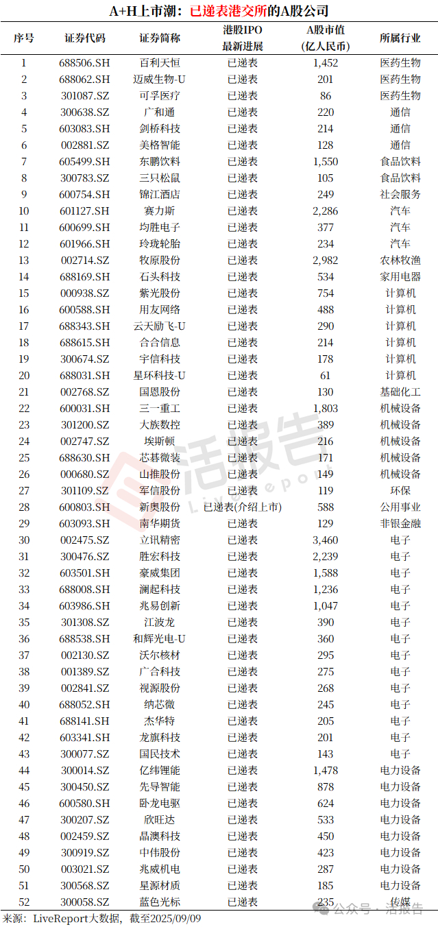 仍在排隊赴港者眾多。據LiveReport大數據統計,目前已遞表港交所的A股公司已達52家,其中千億巨頭超過10家;此外,公告籌劃赴港及傳聞赴港的則有約58家,亦不乏各領域龍頭企業。