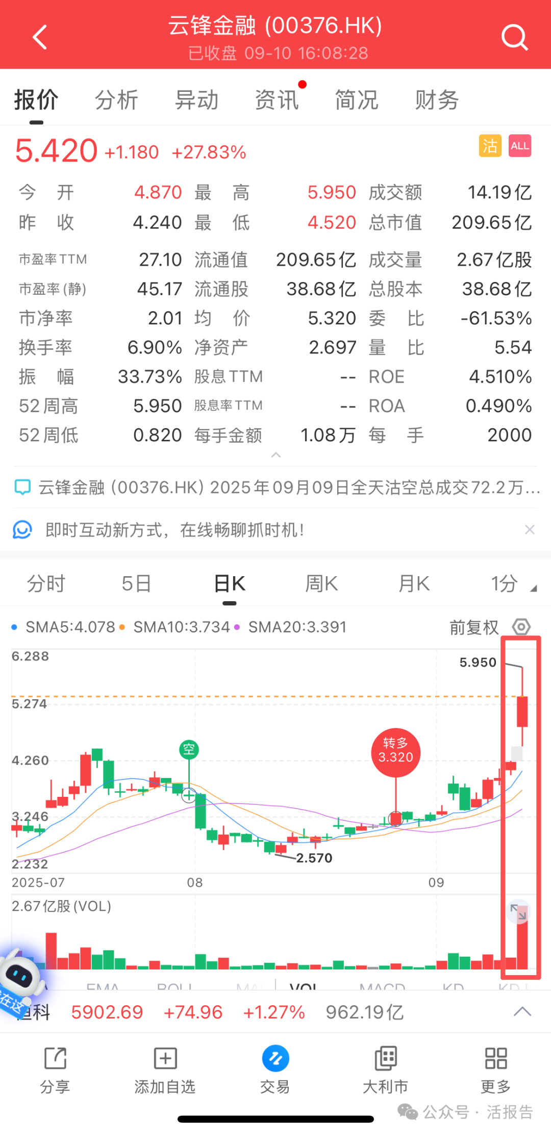阿里虛擬資產新動作!云鋒金融升級1號牌,股價跳開大漲27.83%背靠阿里的云鋒金融(0376.HK)今日股價跳開大漲,一度漲近40%,成交量激增至14.19億,截至9月10日