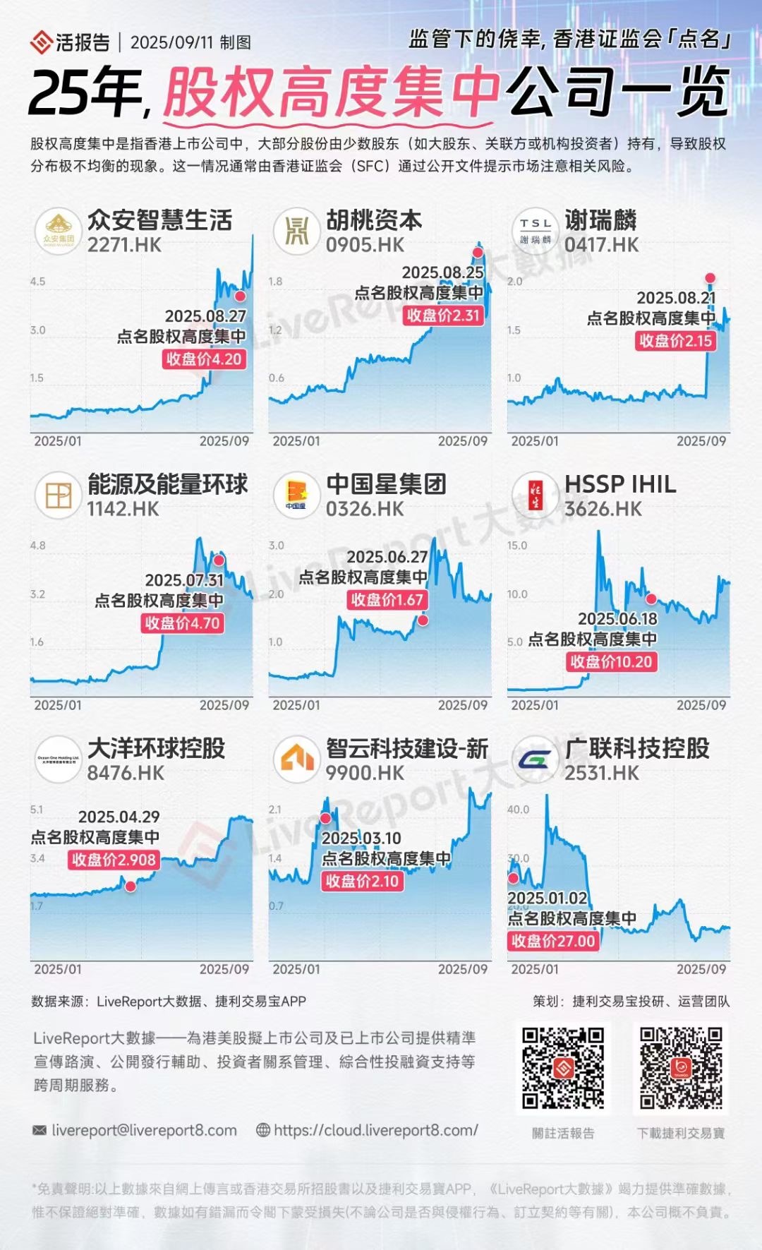 📈LiveReport大數據:2025年股權高度集中公司一覽今年以來,香港證監會已經提示了9家公司股權高度集中的風險 ‼️股權高度集中是指香港上市公司中