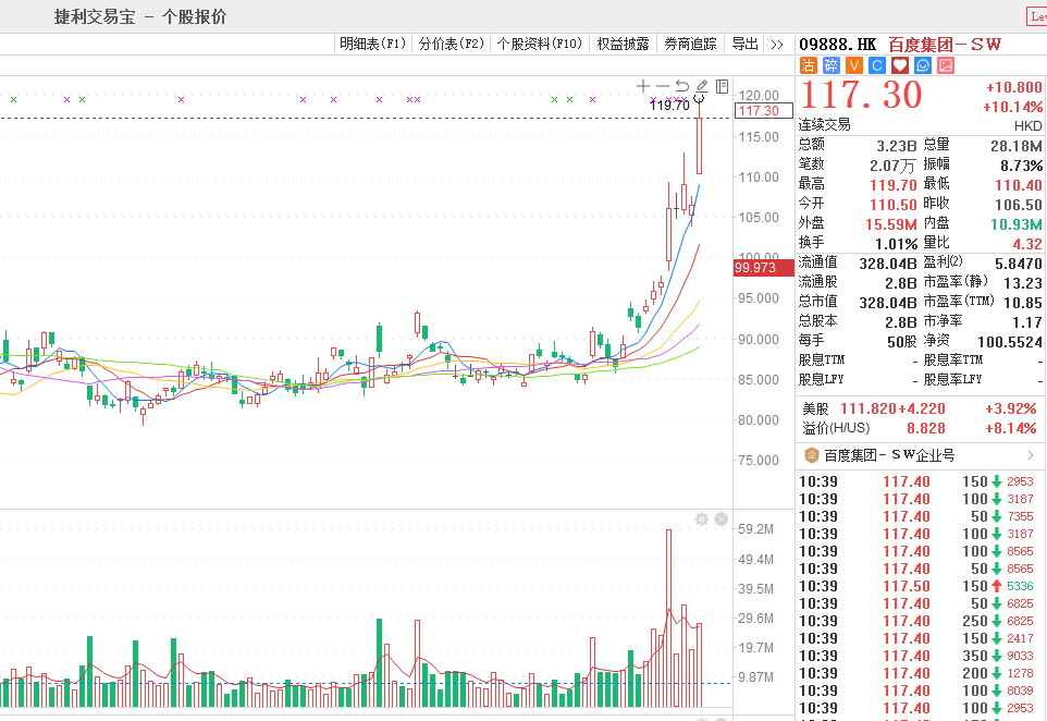 【百度(9888.HK)強勢拉升大漲超12%,創2024年1月以來新高】百度集團-SW(9888.HK)拉升大漲超12%,報119.7港元,創2024年1月以來新高。
