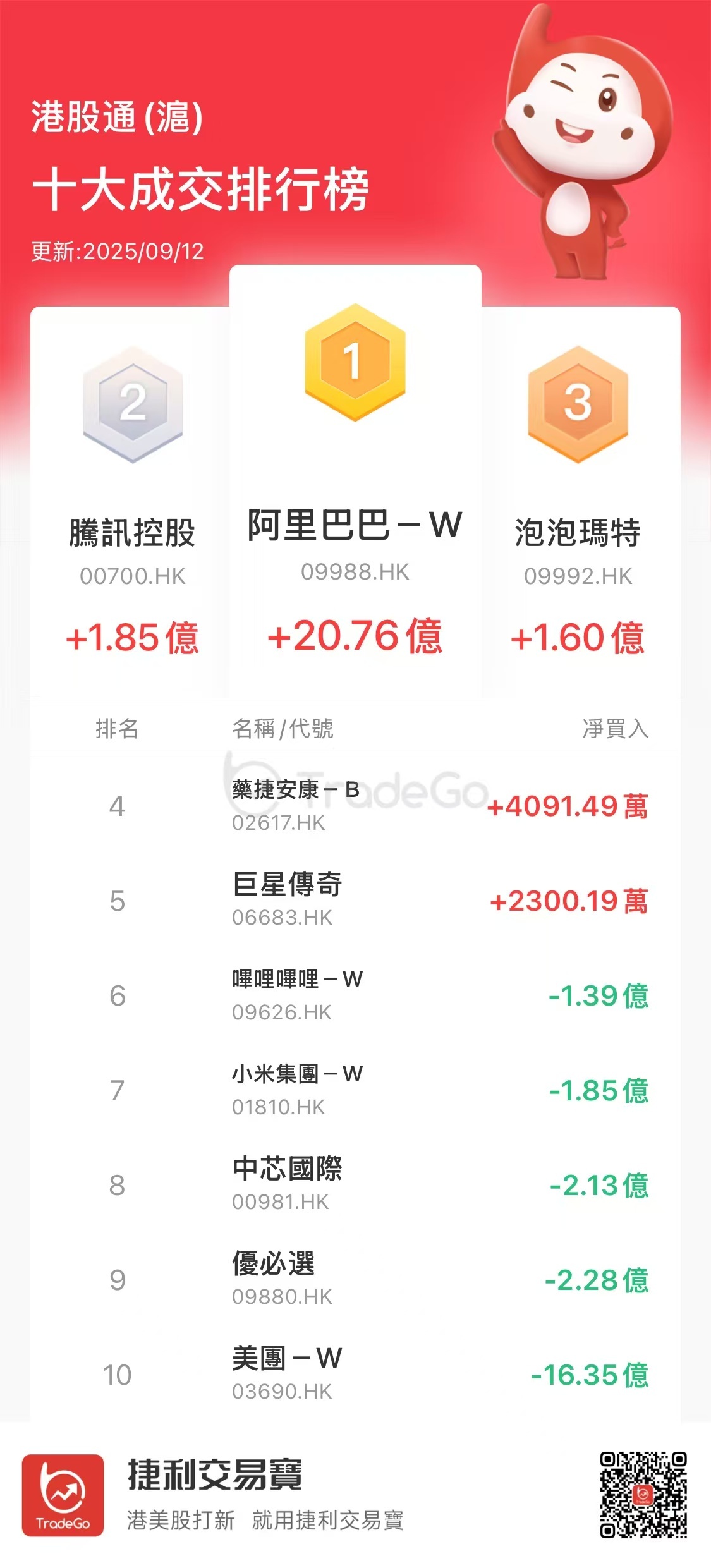 凈買入阿里巴巴-W 43.8億、騰訊控股9.29億、泡泡瑪特6.42億、華虹半導體4.01億、康方生物2.25億、藥捷安康-B 1.8億;