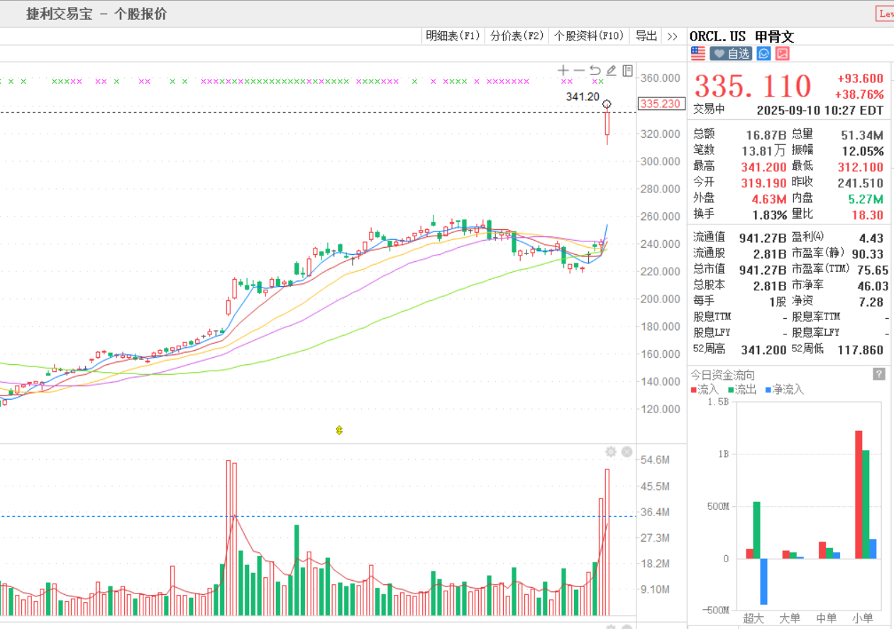 甲骨文股價飆升近41%,創1992年以來最大盤中漲幅。