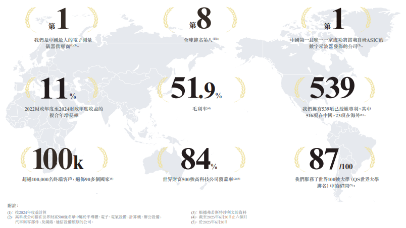 2025年9月29日,普源精電首次向港交所遞交招股書,擬在香港主板上市,獨家保薦人為中信證券。公司是中國領先的電子測量儀器公司,2025年上半年收入3.55億元,凈利潤0.16億元,毛利率近52%。LiveReport獲悉,普源精電科技股份有限公司RIGOL Technologies Co., Ltd.(簡稱“普源精電”)于2025年9月29日在港交所遞交上市申請,擬在香港主板上市。這是該公司第1次遞表香港,其已于2022年4月在A股科創板上市(代碼:688337.SH),截至2025年10月16日,市值約78.52億人民幣。公司是中國領先的電子測量儀器公司,擁有先進的技術實力和遍布全球的龐大版圖。根據弗若斯特沙利文的資料,公司是中國最大的電子測量儀器供貨商,按收益計,于2024年在全球排名第八。公司經過多年專注研究開發及創新,已建立以兩大支柱為基礎的全面電子測量組合:(i)以核心技術驅動的產品矩陣,涵蓋數字示波器、微波射頻(“RF”)儀器、直流(“DC”)精密儀器及模塊化儀器;(ii)多場景解決方案套件,主要服務通信、新能源、半導體、教育與科研等高增長行業。公司的產品組合包括(i)數字示波器,作為“工程師之眼”,可顯示電信號隨時間變化的情況,使測量、診斷和排除電子設備故障變得更加容易;(ii)微波射頻儀器,用于產生及分析高頻信號,這對無線通信技術至關重要;(iii)直流精密儀器,例如波形發生器、直流電源及數字萬用表,允許對電壓及電流等電信號進行溯源、精準測量與控制;及(iv)模塊化儀器,可根據需要定制化并組合成靈活的測試系統,非常適合復雜任務,如自動化生產測試和科學實驗。截至2024年12月31日止3個年度、2024年及2025年前6個月:收入分別約為人民幣6.31億、6.71億、7.76億、3.07億、3.55億,2025年前6月同比+15.57%;毛利分別約為人民幣3.21億、3.58億、4.26億、1.68億、1.84億,2025年前6月同比+9.92%;研發分別約為人民幣-1.26億、-1.43億、-2.07億、-0.88億、-1.08億,2025年前6月同比+23.23%;凈利分別約為人民幣0.92億、1.08億、0.92億、0.15億、0.16億,2025年前6月同比+7.65%;毛利率分別約為50.93%、53.43%、54.90%、54.59%、51.92%;研發費用率分別約為19.92%、21.30%、26.64%、28.63%、30.53%;凈利率分別約為14.67%、16.10%、11.90%、4.90%、4.57%。根據弗若斯特沙利文(Frost & Sullivan)的報告,2024年全球電子測量儀器市場營收達人民幣571億元,由2020年至2024年的復合年增長率為5.1%。預計市場將維持強勁增長勢頭,由2025年至2029年,復合年增長率估計為5.0%。2024年,其中公司成為全球電子測量儀器市場排名最高的中國企業。按2024年收益計,公司是中國最大的數字示波器供貨商,在全球排名第五;公司是中國最大的波形發生器供貨商,在全球排名第三;公司是中國第一且唯一一家成功將搭載自研專用集成電路(“ASIC”)的數字示波器商用化的公司。董事會將由八名董事組成,包括一名執行董事、三名非執行董事及四名獨立非執行董事。王悅博士直接持股約5.93%,通過普源精電投資、銳格合眾、銳進合眾分別持股32.94%、3.05%、3.05%。此外,根據一致行動協議,透過王鐵軍先生、利瓦伊森先生分別持股8.02%、8.02%。據LiveReport大數據統計,普源精電中介團隊共計9家,其中保薦人1家,近10家保薦項目數據表現優秀;公司律師共計2家,綜合項目數據表現一般。整體而言中介團隊歷史數據表現尚可。(本文首發于活報告公眾號,ID:livereport)