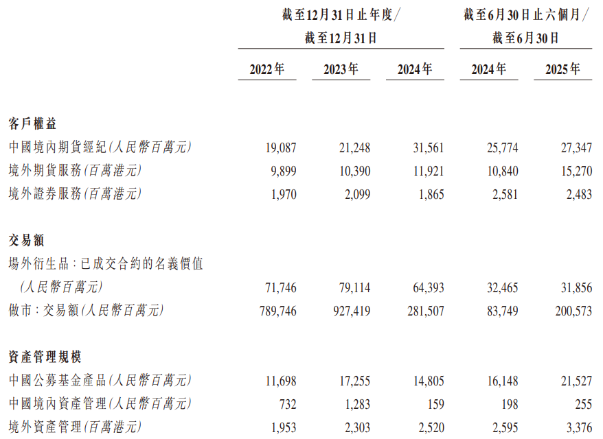 2022、2023、2024年及2025年上半年,公司境外期貨、證券及杠桿式外匯經紀服務的客戶權益總額分別約為119億港元、125億港元、138億港元及178億港元,境外資產管理業務的AUM分別約為20億港元、23億港元、25億港元及34億港元。