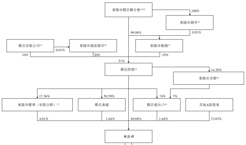 東陽市橫店聯合會控制的橫店控股直接及通過橫店東磁(002056.SZ)等間接方式合計持股約76.97%,其他A股股東持股約23.03%。