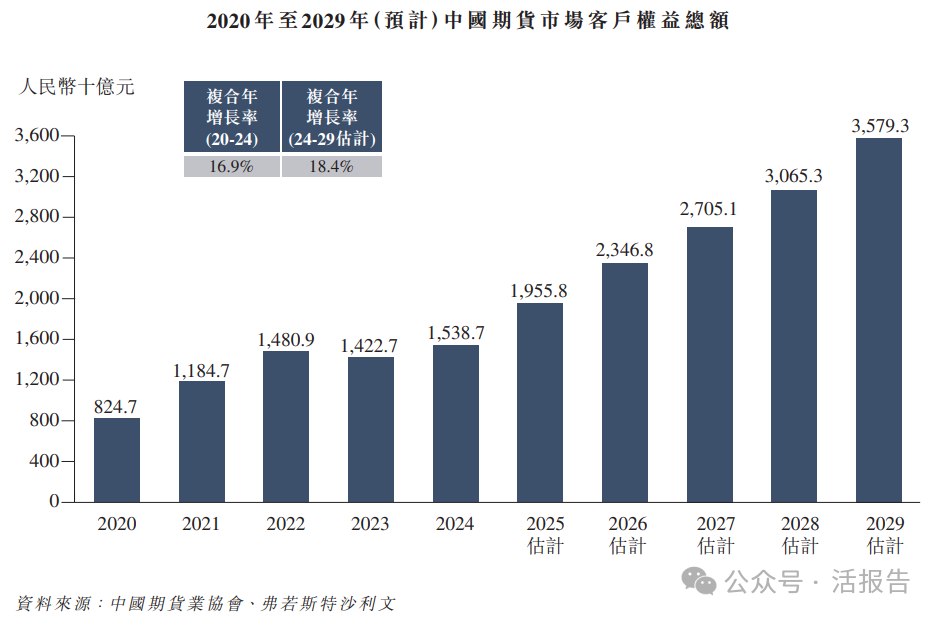 據中國期貨協會及弗若斯特沙利文的數據,2020年至2024年,中國期貨市場的客戶權益總額從人民幣8,247億元大幅增長至人民幣15,387億元,CAGR為16.9%。2024年至2029年,客戶權益總額預計將增至人民幣35,793億元,預計CAGR為18.4%。