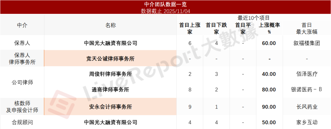 據LiveReport大數據統計,果下科技中介團隊共6家,其中保薦人1家,近10家保薦項目數據表現普通;公司律師共計2家,綜合項目數據表現不足。整體而言中介團隊歷史數據表現較差。