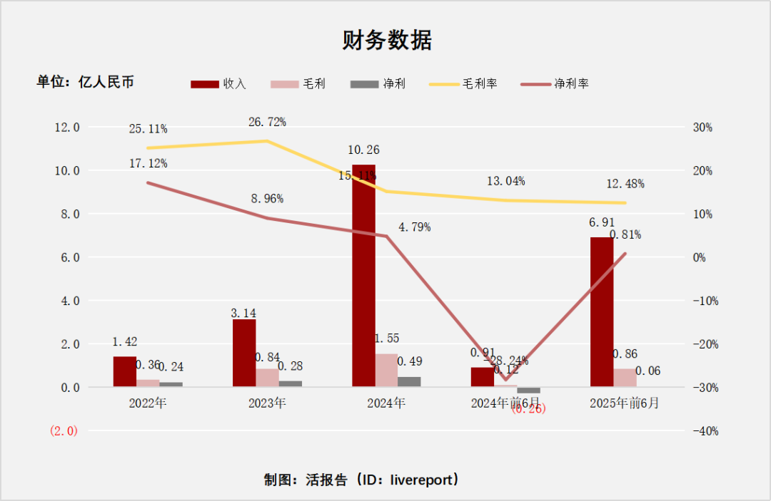 2024年收入為10.26億元,同比增長226.31%;毛利為1.55億元,同比增長84.54%,毛利率為15.11%;凈利潤為0.49億元,同比增長74.50%。2025年上半年收入為6.91億元,同比增長662.91%,凈利潤為0.06億元。
