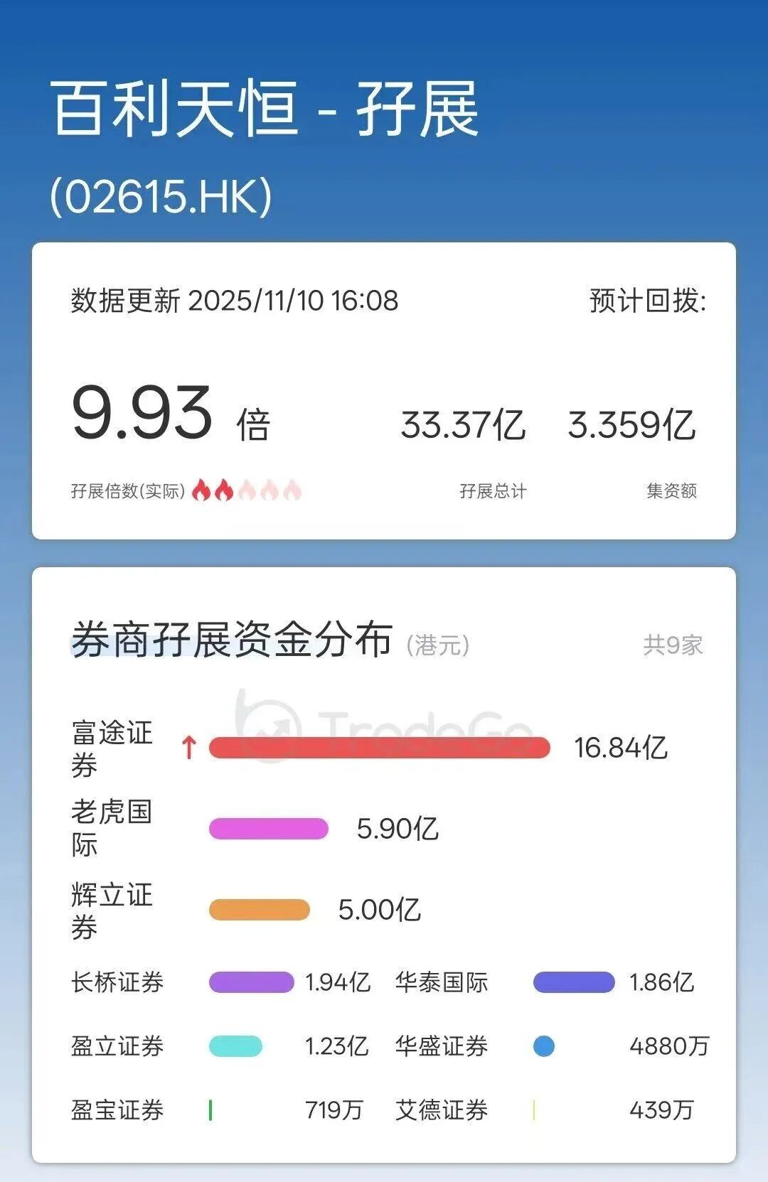 據捷利交易寶的新股孖展數據,截至11月10日16時,百利天恒首日的孖展總額約33.37億港元,孖展認購倍數約9.93倍。其中,富途證券、老虎國際、輝立證券分別放出16.84億、5.9億、5.0億港元。