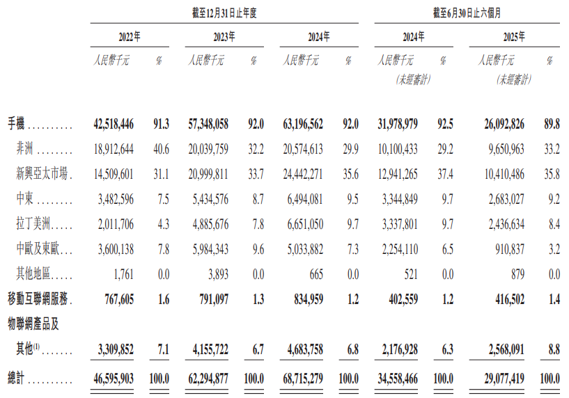 2025年12月2日,傳音控股首次向港交所遞交招股書,擬在香港主板上市,獨家保薦人為中信證券。公司已于2019年9月在A股科創板上市,股票代碼688036,截至12月4日,總市值約791億人民幣。公司是全球領先的智能終端產品和移動互聯網服務提供商,2024年收入超687億元,凈利潤近56億元;2025年上半年收入291億元,同比下降16%,凈利潤12.4億元,同比下滑超五成。公司是全球領先的智能終端產品和移動互聯網服務提供商,主要從事以手機為核心的智能終端產品的設計、研發、生產、銷售和品牌運營,并延展到移動互聯網服務,以及物聯網產品及其他產品,構建產品、服務和品牌的生態鏈。公司已在主要新興市場乃至全球市場取得領先的市場地位。自2013年成立以來,公司即深耕以非洲為代表的新興市場。憑借著領先的市場占有率和廣泛的品牌影響力,公司在手機行業內有著“非洲之王”的美譽。公司主要通過TECNO(面向中高端消費者)、Infinix(面向年輕消費者)和itel(面向大眾市場消費者)品牌提供手機產品。移動互聯網服務:主要以基于自主研發的手機操作系統傳音OS為基礎,通過應用程序組合(Palm Store應用程序分發平臺、AHA Games手機游戲平臺等),提供應用程序下載、游戲及內容瀏覽等業務。物聯網產品及其他:物聯網產品主要包括(i)便攜式計算機及平板計算機、(ii)智能手表、(iii)智能音頻設備,例如真正無線立體聲(“TWS”)耳機、(iv)數碼配件,例如充電寶、及(v)家用電器,例如智能電視及廚房電器。儲能產品主要包括(i)混合逆變器、(ii)鋰電池模塊、(iii)集成儲能系統及(iv)光伏模塊。輕型電動出行設備主要包括(i)兩輪電動車及(ii)三輪電動車。截至2024年12月31日止3個年度、2024年及2025年前6個月:收入分別約為人民幣465.96億、622.95億、687.15億、345.58億、290.77億,2025年前6月同比-15.86%;毛利分別約為人民幣92.55億、144.40億、143.41億、72.01億、55.33億,2025年前6月同比-23.17%;凈利分別約為人民幣24.67億、55.87億、55.97億、28.64億、12.42億,2025年前6月同比-56.65%;毛利率分別約為19.86%、23.18%、20.87%、20.84%、19.03%;凈利率分別約為5.29%、8.97%、8.15%、8.29%、4.27%。根據弗若斯特沙利文(Frost & Sullivan)的報告,2024年,全球手機市場規模已達0.5兆美元,預計2029年將達0.6兆美元,2024年至2029年的年復合增長率為4.6%。此外,全球移動互聯網服務市場規模為2.9兆美元,預計2029年將達7.6兆美元,2024年至2029年的年復合增長率為21.5%。2024年按銷量計,公司為全球手機市場第三大廠商。董事會將由10名董事組成,包括六名執行董事及四名獨立非執行董事。雇員持股平臺傳音投資持股46.71%,其中竺先生持股20.68%;聯發科(2454.TW)全資子公司Digimoc Holdings Limited通過CSAML持股6.22%;據LiveReport大數據統計,傳音控股中介團隊共計8家,其中保薦人1家,近10家保薦項目數據表現出色;公司律師共計2家,綜合項目數據表現有待提升。整體而言中介團隊歷史數據表現普通。(本文首發于活報告公眾號,ID:livereport)