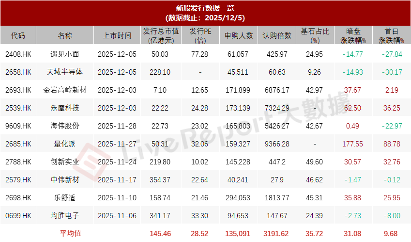據LiveReport大數據,近10家上市新股平均發行市值為145.46億,最大市值為中偉新材,最小市值為金巖高嶺新材;平均發行PE為28.52倍,PE處于中上水平;平均申購人數為135,091人,平均認購倍數為3191.62倍;平均基石占比為35.72%,基石平均比例略有下降;