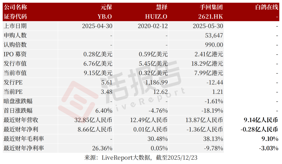 2025年12月23日,白鴿在線通過港交所聆訊,擬在香港主板上市,聯席保薦人為民銀資本、中銀國際。公司已于2025年11月28日完成中國證監會境外上市備案。公司是中國領先的場景險數字化風險管理解決方案提供商,2024年收入9.14億元,凈虧損0.28億元;2025年上半年收入5.67億元,凈虧損0.22億元。公司是一家保險科技公司,主要從事為場景合作伙伴及保險公司提供科技賦能的保險中介服務,通過提供保險交易服務、精準營銷及數字化解決方案以及第三方管理服務(TPA)獲得收入。按2024年總保費計,公司在中國互聯網保險中介中位列第十一、在中國場景互聯網保險中介中位列第五及在中國第三方場景互聯網保險中介中位列第一,中國市場份額為3.4%。作為保險公司、場景合作伙伴及終端消費者之間的數字連接器,公司在解決方案設計及定制方面與上游保險公司及下游場景合作伙伴緊密合作,為所有生態系統參與者提供數字化保險服務。公司的收入主要來自:(i)保險交易服務,公司就協助保險公司成功交付由其承保的保險產品向其收取傭金;(ii)精準營銷及數字化解決方案,包括各企業支付的項目費用;及(iii)主要由保險公司支付的TPA服務費。截至2024年12月31日止3個年度、2024及2025年前6個月:收入分別約為人民幣4.05億、6.60億、9.14億、4.24億、5.67億,2025年前6月同比+33.82%;