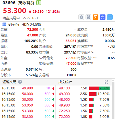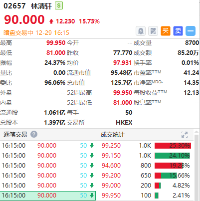 華盛資訊12月29日訊,港股林清軒、英矽智能正在暗盤交易中。截至發稿,林清軒漲超15%,中簽一手賬面浮盈611.5港元,最新總市值超95億港元;英矽智能飆升超121%,中簽一手賬面浮盈14625港元,最新總市值超297億港元。