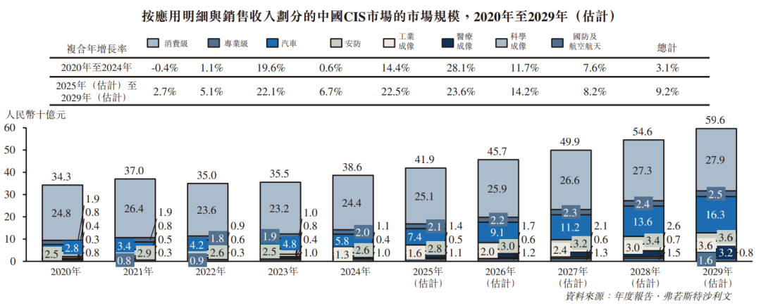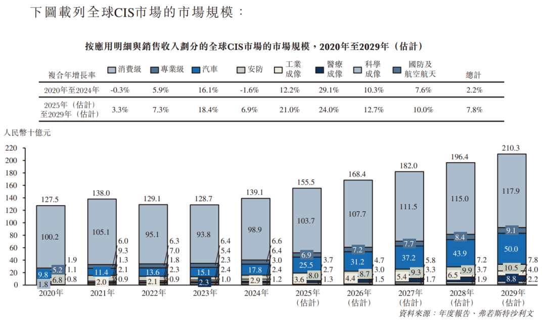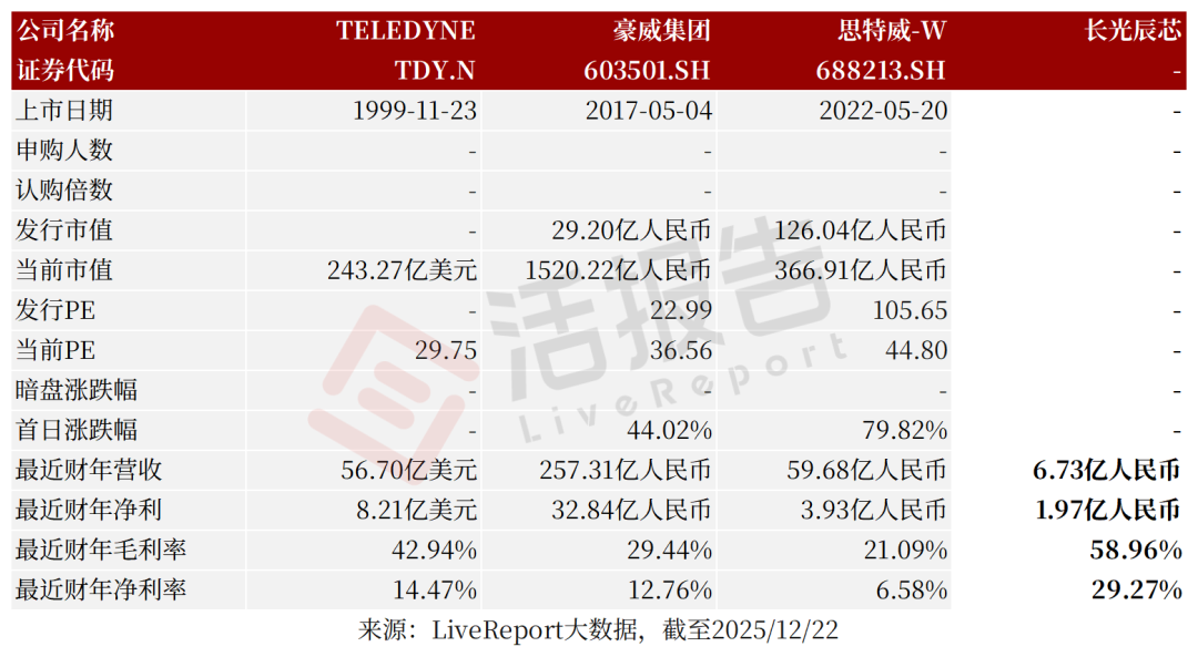 2025年12月19日,長光辰芯第2次向港交所遞交招股書,擬在香港主板上市,聯席保薦人為中信證券、國泰海通。公司曾于2023年6月提交A股科創板上市申請,但經綜合考慮多項因素后于2025年1月主動撤回。公司是CMOS圖像傳感器(CIS)提供商,2024年收入6.73億元人民幣,凈利潤1.97億元,毛利率58.96%;2025年前9月收入5.65億元,同比增長兩成,凈利潤1.48億元,同比增長近四成,毛利率64.21%。公司是CMOS圖像傳感器(CIS)提供商,專注于高性能CMOS圖像傳感器的研發,提供的九大產品系列,廣泛適用于工業成像、科學成像、專業影像和醫療成像等先進技術領域。公司于2015年成功研發世界上第一款BSI、sCMOS圖像傳感器,截至目前,公司目前已掌握11項專有核心技術,包括全局快門像素、HDR像素、高靈敏度像素、HDR讀出電路、低噪聲電路、高性能ADC電路、高速讀出電路、TDI圖像傳感器、BSI圖像傳感器、3D成像傳感器及3D晶圓堆棧。該等技術在CMOS圖像傳感器的像素設計、電路設計和工藝開發方面建立起強大的技術壁壘。于2024年按工業成像收入計,公司在全球CIS公司中排名第三,在中國CIS公司中排名第一,占全球市場份額的15.2%;于2024年按科學成像收入計,公司在全球CIS公司中排名第三,在中國CIS公司中排名第一,占全球市場份額的16.3%。公司以無晶圓廠的業務模式運營,公司以傳感器設計為業務核心,設計完成后交付第三方晶圓代工廠進行生產制造,并由公司自主進行晶圓測試,后交由第三方封裝廠進行封裝(公司已逐步承接部分封裝產能),在封裝完成后公司自主進行最終測試。公司的高性能CMOS圖像傳感器可以按像素排列分為(i)面陣傳感器及(ii)線陣傳感器。面陣傳感器的像素排列呈二維矩陣,使其能夠在一次曝光中捕集完整的二維圖像。相比之下,線陣傳感器的像素排列呈直線,并通過掃描與傳感器方向垂直、并以恒定速度移動的物體來捕集二維圖像。截至2024年12月31日止3個年度、2024年及2025年前9個月:收入分別約為人民幣6.04億、6.05億、6.73億、4.58億、5.65億,2025年前9月同比+23.22%;毛利分別約為人民幣4.60億、3.84億、3.97億、2.54億、3.63億,2025年前9月同比+43.03%;凈利分別約為人民幣-0.84億、1.70億、1.97億、1.07億、1.48億,2025年前9月同比+38.27%;毛利率分別約為76.16%、63.48%、58.96%、55.32%、64.21%;凈利率分別約為-13.91%、28.08%、29.27%、23.29%、26.14%。公司收入主要來自CMOS圖像傳感器業務,2023年和2024年占總營收比例分別達83.5%和75.8%;其中重大部分來自面陣傳感器,2023年和2024年占比分別為67.7%和61.6%;線陣傳感器收入占比相對較小,2023年和2024年分別為14.4%和12.2%。截至2025年9月30日,公司經營活動現金流為2.60億,期末現金約為1.94億。根據弗若斯特沙利文(Frost & Sullivan)的報告,2020年至2024年期間,全球CIS市場呈現溫和增長,總收入從人民幣1275億元增加至人民幣1391億元,復合年增長率為2.2%。2025年至2029年期間,全球CIS市場規模增速預計將加快,總收入預計從2025年的人民幣1555億元增長至2029年的人民幣2103億元,復合年增長率為7.8%。自2020年至2024年,中國CIS市場保持穩定增長,市場規模由人民幣343億元擴大至人民幣386億元,復合年增長率為3.1%。展望2025年至2029年,中國CIS市場預期將維持其增長趨勢,由人民幣419億元擴大至人民幣596億元,預計復合年增長率為9.2%。由于公司的核心業務集中在工業及科學成像,因此排名在這兩個領域中呈現。同行業IPO可比公司:TELEDYNE、豪威集團、思特威-W。長光辰芯的董事會由九名董事組成,包括三名執行董事、三名非執行董事及三名獨立非執行董事。欣洋博士、張艷霞博士夫婦,直接及間接方式合計持股約49.53%;其他股東包括奧普光電(002338.SZ)、凌云光(688400.SH)等。于2022年6月10日,通過股權轉讓協議,若干現有股東向22名上市前投資者轉讓部份股本權益,每股概約成本為人民幣27.03元,對應當時公司的投后估值約100億人民幣。據LiveReport大數據統計,長光辰芯中介團隊共計10家,其中保薦人2家,近10家保薦項目數據表現尚可;公司律師共計4家,綜合項目數據表現普通。整體而言中介團隊歷史數據表現中規中矩。