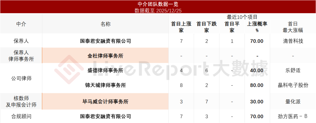 據LiveReport大數據統計,承泰科技中介團隊共計6家,其中保薦人1家,近10家保薦項目數據表現尚可;公司律師共計2家,綜合項目數據表現普通。整體而言中介團隊歷史數據表現有待提升。