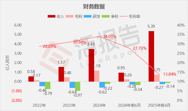 收入分別約為人民幣0.58億、1.57億、3.48億、0.95億、5.39億,2025年前6月同比+464.62%;