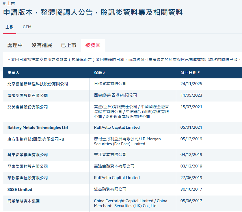 繼證監會和港交所本月初向新股保薦人致函表達,上市申請質量下降的憂慮后,聯交所的網站近日披露,時隔兩年半再有上市申請人被發回,為由內地轉戰香港上市、工業物聯網軟件解決方案技術開發商“德風新征程”。
