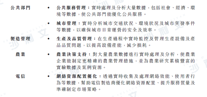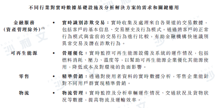 隨著5G、人工智能、物聯網等技術的廣泛應用,中國各行業的數字化進程不斷加快。數據應用場景增加、數據源更加多樣化,且數據量快速增長。除資產管理行業外,隨著企業數字化轉型不斷加速,許多其他行業對實時數據管理的需求亦有所增加。其中部分行業包括金融服務業(資產管理除外)、可再生能源、零售、物流、制造管理、農業及電信行業,以及公共部門。該等行業對實時數據基礎設施及分析解決方案的需求和關鍵應用場景因不同的業務需求而異: