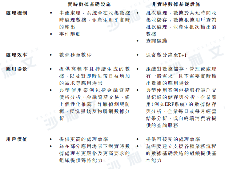 數據基礎設施是指支撐組織內數據收集、清洗、管理、分析或治理的系統。根據處理機制與效率,數據基礎設施可分為實時數據基礎設施與非實時數據基礎設施。這兩種類型的數據基礎設施分別是為滿足處理數據的不同需要而設計。下表說明兩種數據基礎設施之間的主要差異: