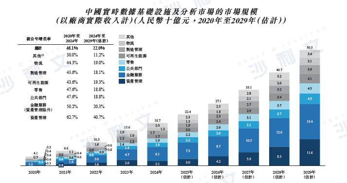 近年來,中國資產管理以外行業的實時數據基礎設施及分析市場增長迅速,按供應商實際收入計算,由2020年的人民幣38億元增加至2024年的人民幣166億元,2020年至2024年的復合年增長率為44.6%,并預計于2029年將達到人民幣389億元,2024年至2029年的復合年增長率為18.6%。