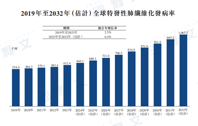 根據沙利文的資料,全球IPF的發病人數由2019年的554.5千例增加至2023年的612.4千例,復合年增長率為2.5%。此乃由于人口老齡化率增加、對該危及生命的疾病認知及診斷增加及不健康的生活方式普遍存在所致。新增病例數目預計將繼續增加至2032年的1,067.7千例,2023年至2032年的復合年增長率增至6.4%。