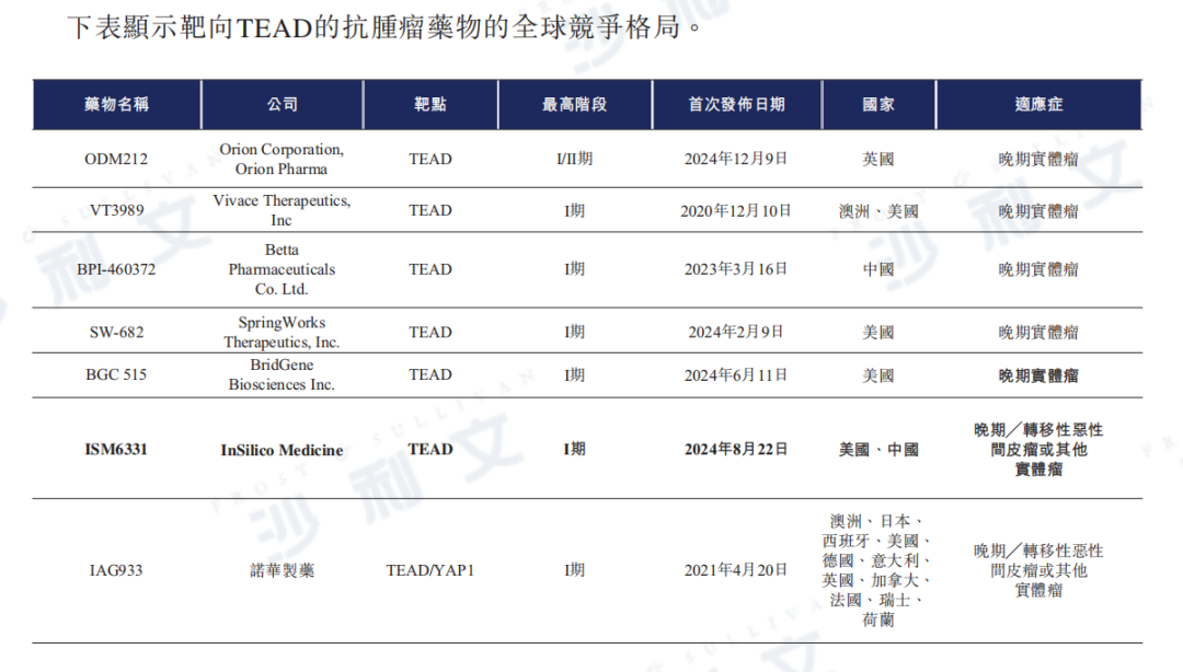 下表列示了靶向TEAD的抗腫瘤藥物的全球競爭格局。