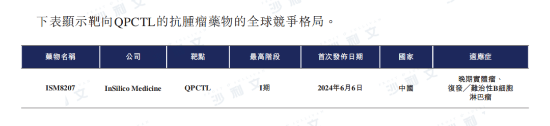下表列示了靶向QPCTL的抗腫瘤藥物的全球競爭格局。