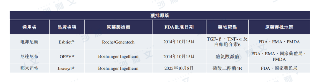 截至最后實際可行日期,全球范圍內僅有吡非尼酮(Roche/Genentech的Esbriet®)、尼達尼布(Boehringer Ingelheim的OFEV®)及那米司特(Boehringer Ingelheim的Jascayd®)獲批準用于治療IPF。目前全球有近100種處于臨床階段的活性IPF候選藥物,其中25種為小分子藥物。此外,全球共有2種候選藥物已進行III期臨床試驗。下表載列三種獲批原研藥物的全球競爭格局。