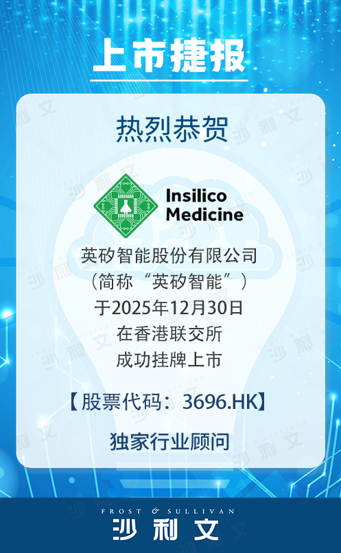 英矽智能股份有限公司(股票代碼:3696.HK)于2025年12月30日成功登陸香港資本市場主板。公司專注于AI驅動的創新藥物研發,依托自主研發的Pharma.AI平臺,高效推進藥物發現至臨床開發全鏈條,推動AI驅動藥物研發的持續創新與發展。弗若斯特沙利文(Frost & Sullivan, 以下簡稱“沙利文”)為英矽智能股份有限公司上市提供獨家行業顧問服務,特此熱烈祝賀其成功上市。