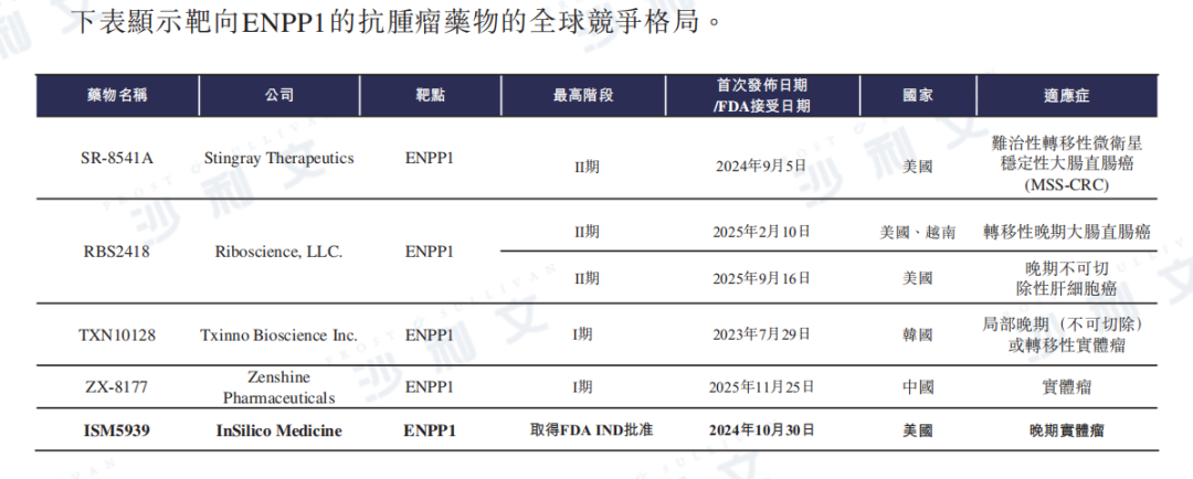 下表列示了靶向ENPP1的抗腫瘤藥物的全球競爭格局。