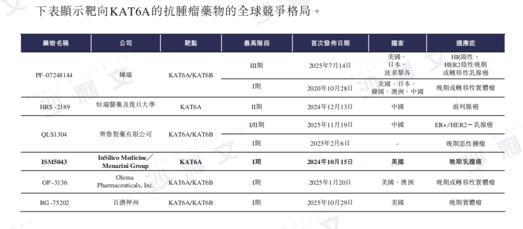 下表列示了靶向KAT6A的抗腫瘤藥物的全球競爭格局。