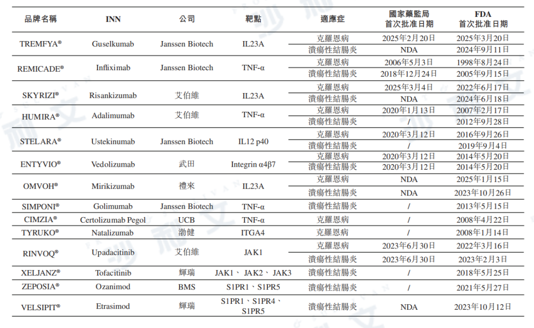 炎癥性腸病(IBD)是指一組慢性、復發性的胃腸道炎癥,主要包括克羅恩病(CD)及潰瘍性結腸炎(UC)。IBD的特點是持續性腹瀉、腹痛、直腸出血、體重下降及乏力等癥狀,可嚴重影響患者的生活素質。雖然IBD的確切原因仍不清楚,但普遍認為它是遺傳易感性、環境誘因、腸道微生物群失衡和免疫系統功能障礙復雜相互作用的結果。IBD治療的主要目標是控制引發癥狀的炎癥,更廣泛的目標是誘導和維持緩解以及預防并發癥。治療通常涉及藥物治療,且在若干情況下,視乎疾病的嚴重程度及個別患者的反應而涉及手術。藥物治療通常從抗炎藥開始。免疫調節劑(如硫唑嘌呤)亦常用于抑制免疫反應及減少腸道內壁釋放炎癥誘導化學物質。近年來,生物制劑療法通過特異性靶向及中和導致IBD慢性發炎的關鍵免疫蛋白,已改變了IBD的治療格局。下表列示IBD的主要已上市藥物的全球競爭格局。