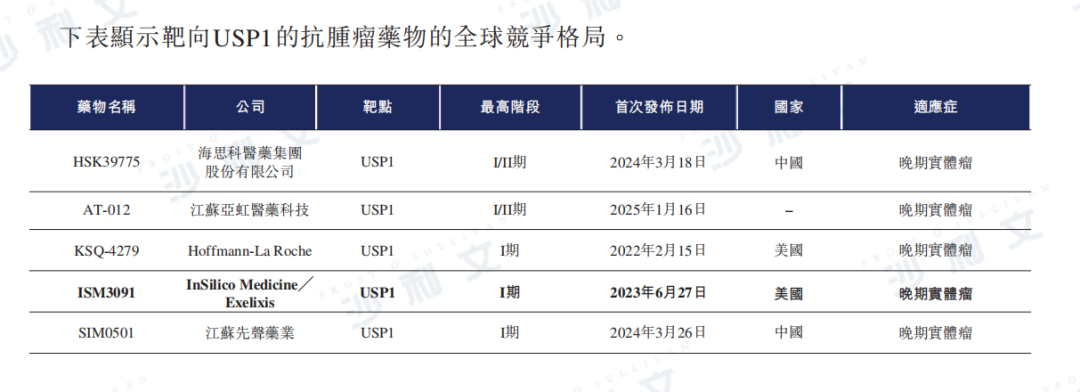 下表列示了靶向USP1的抗腫瘤藥物的全球競爭格局。