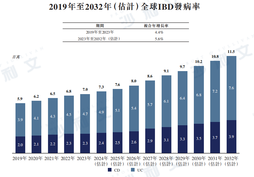 根據沙利文的資料, 全球IBD發病人數目穩步增加。流行病學研究顯示,全球IBD發病人數由2019年的約590萬例上升至2023年的700萬例,復合年增長率為4.4%。預計全球IBD發病人數于2032年將達到約1150萬例,2023年至2032年的復合年增長率為5.6%。