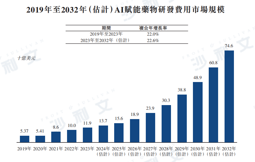 預計全球AI賦能藥物研發費用市場規模由2023年的119億美元增加至2032年的746億美元,復合年增長率為22.6%,如下圖所示。