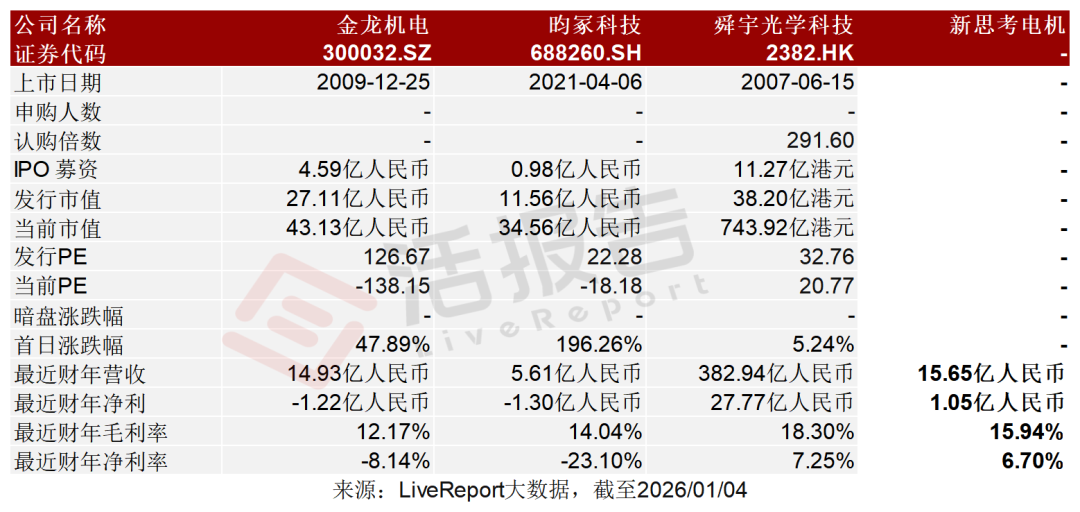 2026年1月2日,新思考電機首次向港交所遞交招股書,擬在香港主板上市,聯席保薦人為華泰國際和中金公司。公司是微型精密馬達制造商,2024年收入15.65億元,凈利潤1.05億元,毛利率15.94%。2025年前9月收入14.57億元,凈利潤0.97億元,毛利率16.08%。2025年前9月,公司收入毛利保持高增。公司成立于2014年,是一家全球領先的微型精密馬達制造商。公司已形成“嘉興+合肥”雙生產基地、“中國+日本”雙研發基地的戰略布局,使公司能夠憑借先進產品持續拓展業務邊界,以保持長期競爭優勢。根據弗若斯特沙利文的資料,以2024年的收入計,公司在影像馬達市場位列全球第六名、中國第三名,占中國影像馬達市場的9.1%。以2024年的收入計,在光學防抖(“光學防抖”)影像馬達領域,公司位列全球第四名、中國第一名,占中國市場份額的20.1%。根據功能的差異,公司的影像產品主要包括光學防抖馬達、潛望馬達、開環馬達、閉環馬達、可變光圈馬達、連續光學變焦馬達等。公司的非影像產品主要包括步進馬達及無刷直流(“無刷直流”)馬達等,已部署于掃地機器人、安防監控、汽車電子等應用場景。于往績記錄期間,公司的絕大部分收入產生自影像產品,尤其是光學防抖馬達及潛望馬達、開環馬達及閉環馬達。截至2024年12月31日止2個年度、2024及2025年前9個月:收入分別約為人民幣8.55億、15.65億、11.09億、14.57億,2025年前9月同比+31.40%;毛利分別約為人民幣0.71億、2.49億、1.82億、2.34億,2025年前9月同比+28.46%;凈利分別約為人民幣-0.30億、1.05億、0.91億、0.97億,2025年前9月同比+6.50%;毛利率分別約為8.36%、15.94%、16.45%、16.08%;凈利率分別約為-3.52%、6.70%、8.22%、6.66%。截至2025年9月30日,公司賬上現金約1.33億元,應收賬款約8.12億元,短期貸款0.31億元,長期借款1.14億元,2025年前9月經營現金流約0.07億元。根據弗若斯特沙利文(Frost & Sullivan)的報告,2019年,全球影像馬達的市場規模約為45億美元,到2024年增長至73億美元,復合年增長率為10.2%。預計2025年至2029年市場將繼續增長,復合年增長率預計為8.0%,到2029年市場規模約達109億美元。2019年,中國影像馬達的市場規模約為人民幣96億元,預計到2024年將增長至人民幣167億元,復合年增長率為11.7%。預計2025年至2029年市場將維持增長趨勢,復合年增長率預計為9.6%,到2029年市場規模約達人民幣269億元。全球光學防抖馬達市場前10大主要制造商合計約占63.4%的市場份額,公司的市場份額為8.0%。中國光學防抖馬達市場前10大主要制造商合計約占86.5%的市場份額,公司以20.1%的市場份額位居榜首。金龍機電(300032.SZ)、昀冢科技(688260.SH)、舜宇光學科技(2382.HK)公司董事會將由七名董事組成,包括三名執行董事、一名非執行董事及三名獨立非執行董事。蔡振鵬博士直接持股17.38%(7.50%+9.88%),并通過其全資公司深圳和正間接持股27.04%,通過深圳長鑫、嘉善長鑫及合肥嘉投間接持股8.33%、3.38%及0.83%,合計持股約56.97%。嘉善經開持股8.33%,中金公司(3908.HK、601995.SH)通過中金實體持股6.92%,屹唐華創持股5.53%,敦鴻實體持股5.28%,其他投資者持股16.98%。公司上市前經歷了多輪融資,累計融資逾10.9億元人民幣。在2023年1月的C+輪最新融資中,公司的投后估值約為24億人民幣。據LiveReport大數據統計,新思考電機中介團隊共計10家,其中保薦人2家,近10家保薦項目數據表現一般;公司律師共計3家,綜合項目數據表現欠佳。整體而言中介團隊歷史數據表現平平。