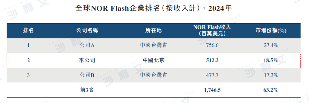 在NOR Flash領域,公司排名全球第二、中國內地第一,全球市場份額為18.5%;